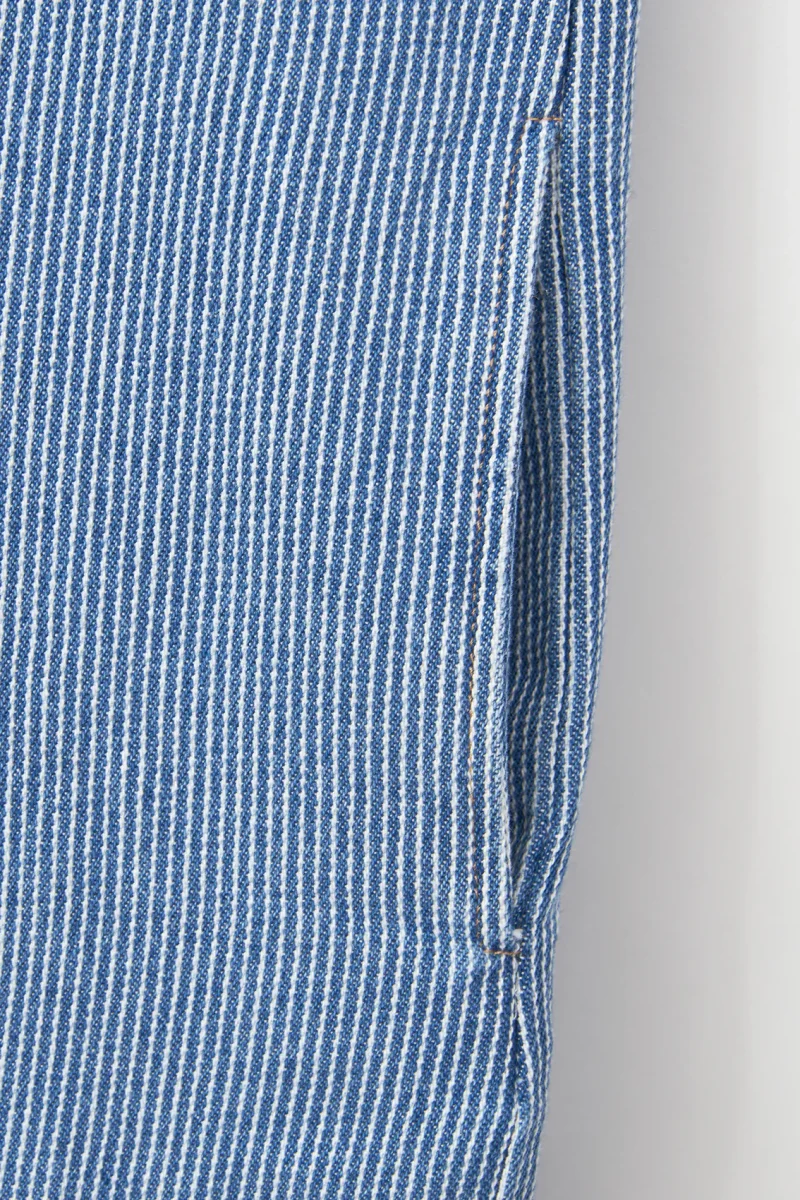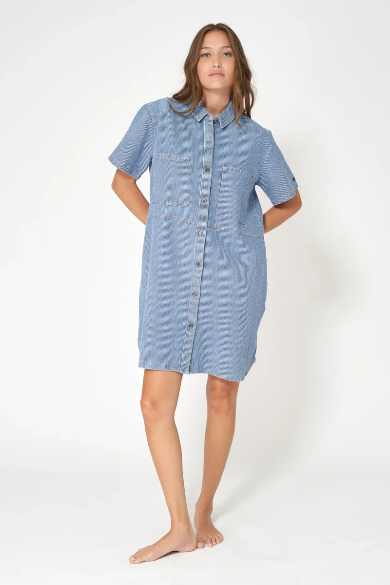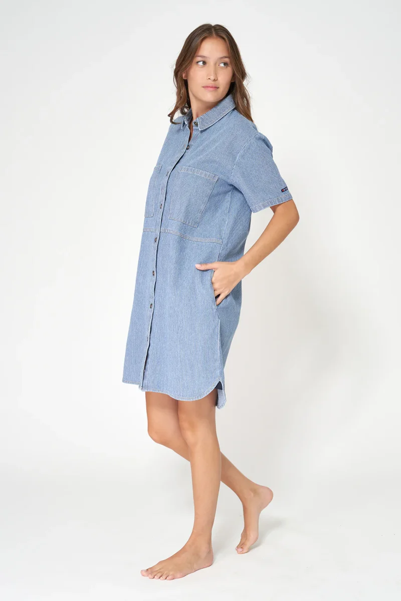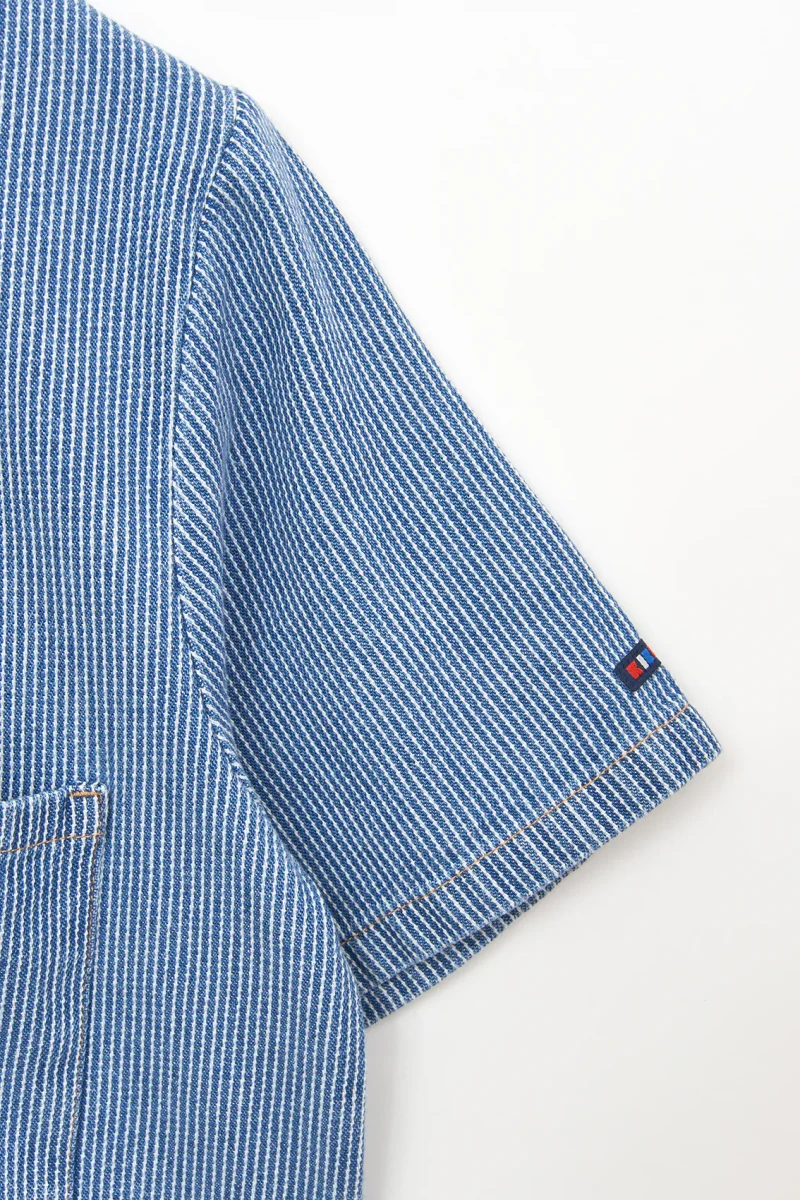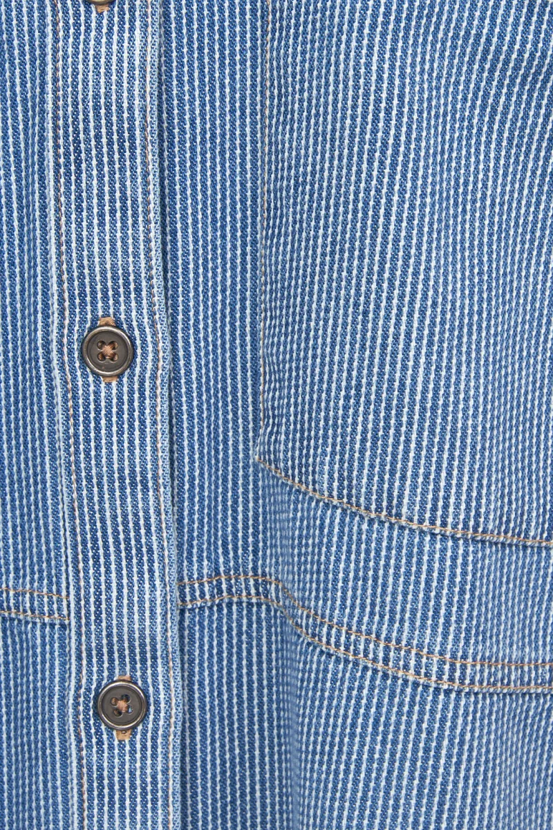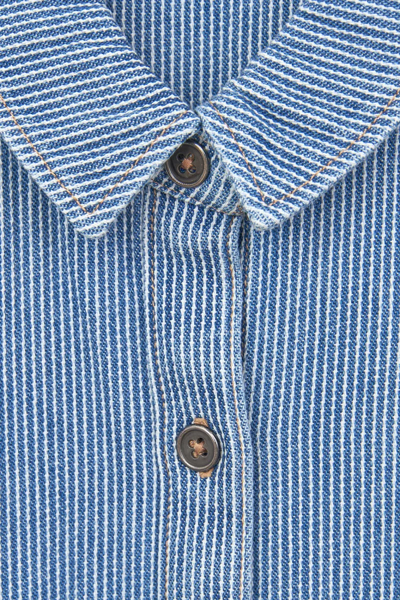 Vestido camisero confeccionado en algodón con rayas efecto denim, un tejido ligero con estructura que le da presencia sin resultar rígido.
