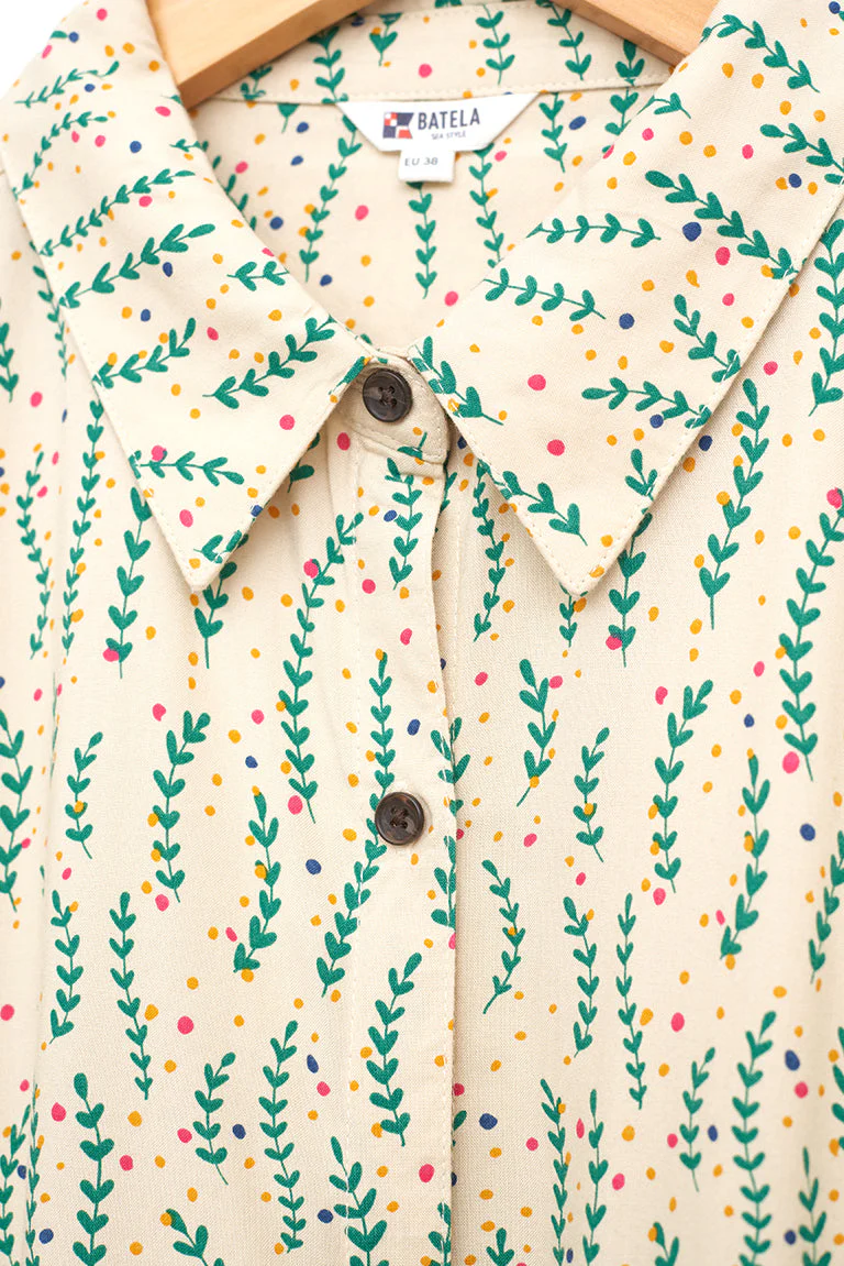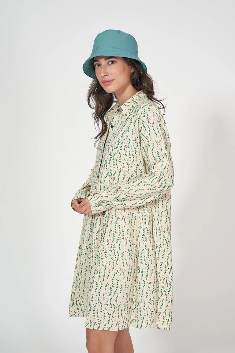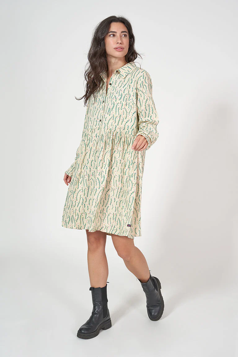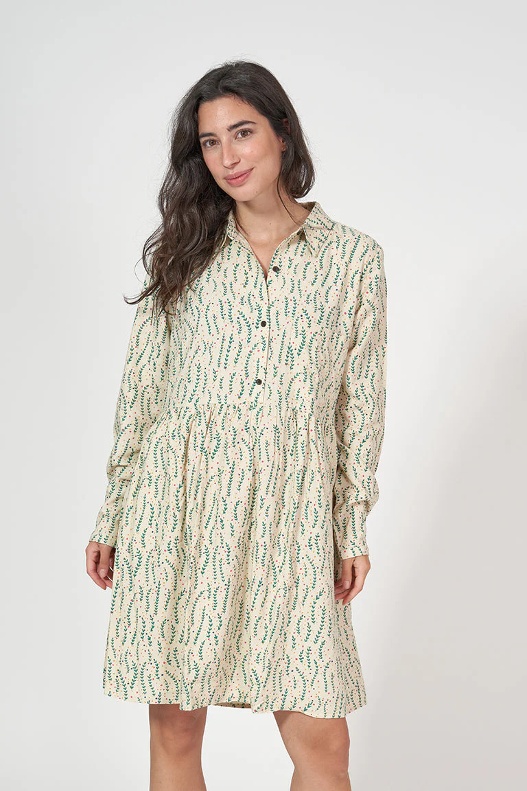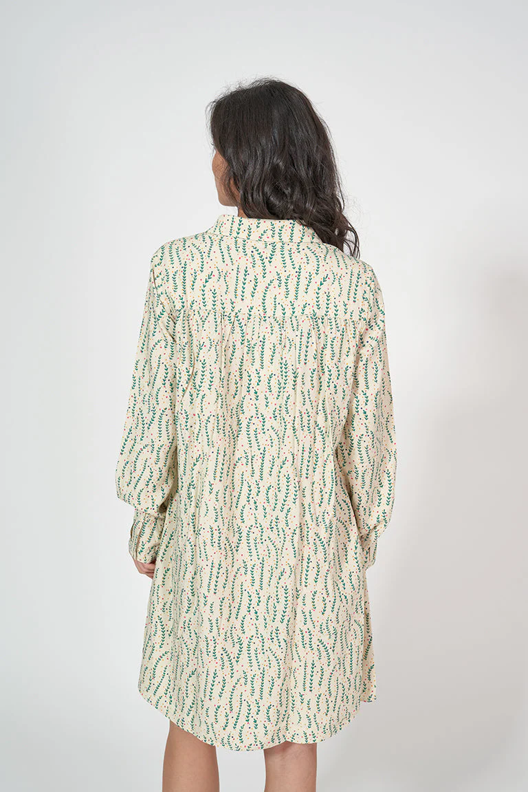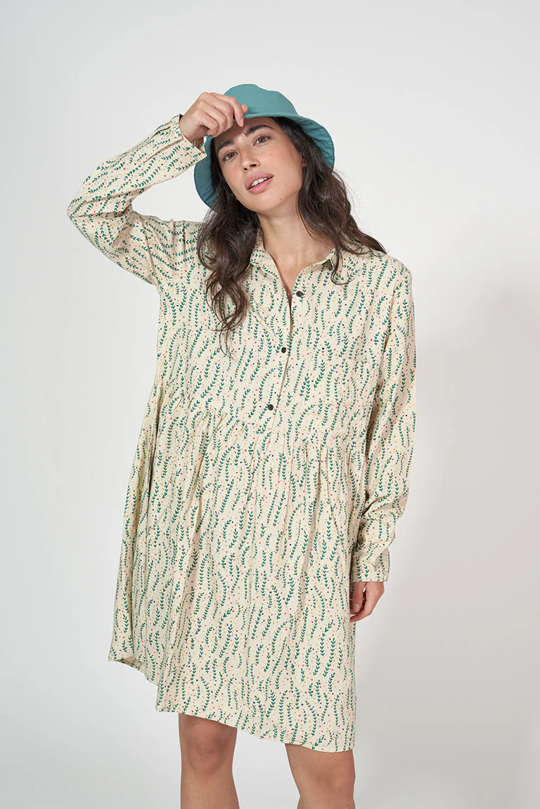 Vestido camisero de manga larga con estampado de hojas. Tiene cuello camisero y una abertura frontal con botonadura hasta la cintura y bolsillo plastrón sobre el pecho. La cintura tiene una costura fruncida por la parte delantera, dando volumen a la prenda.