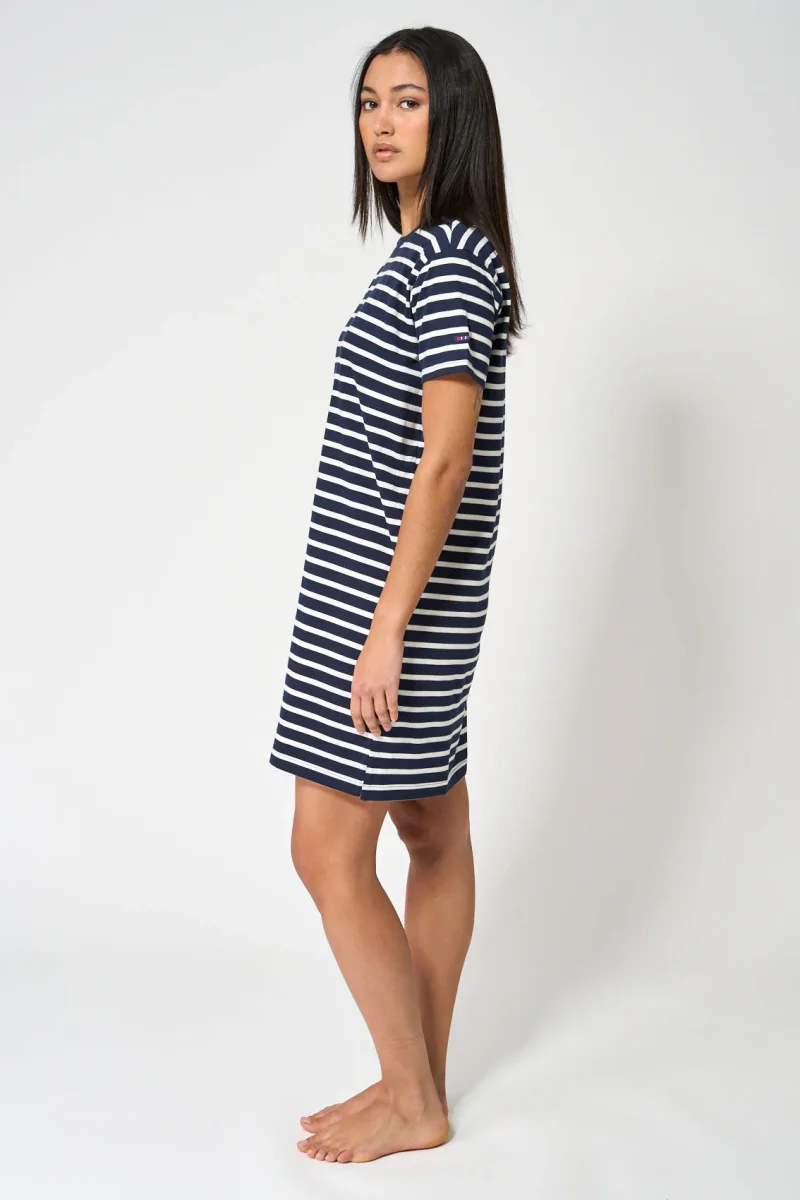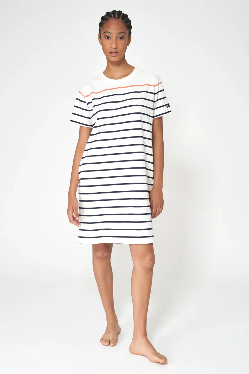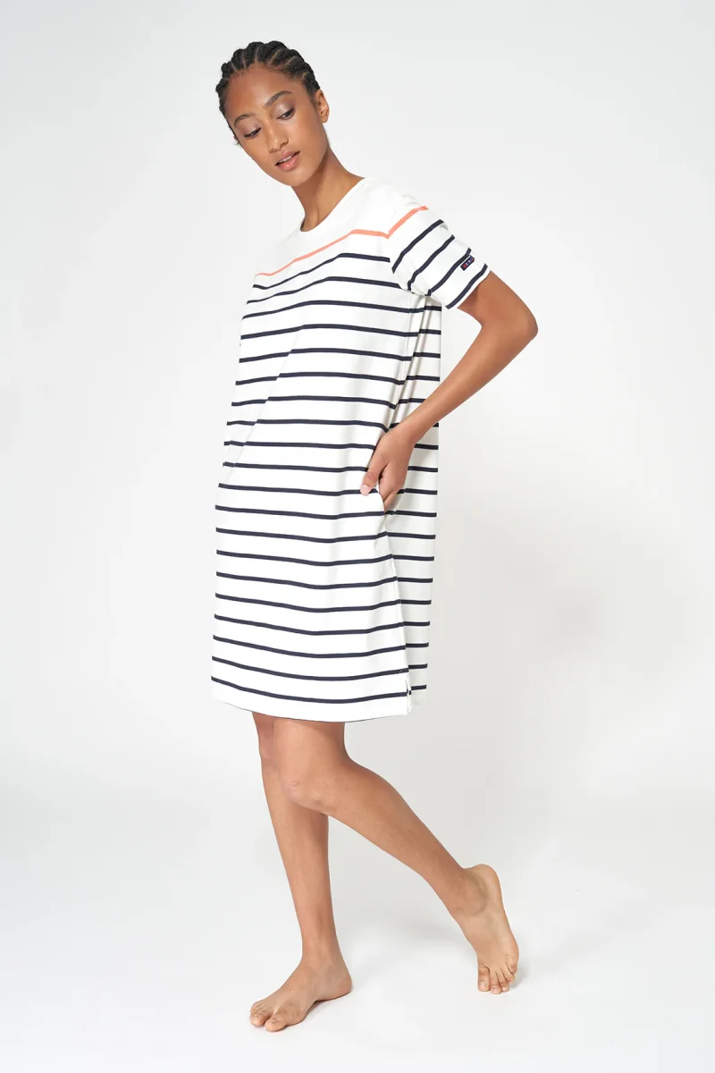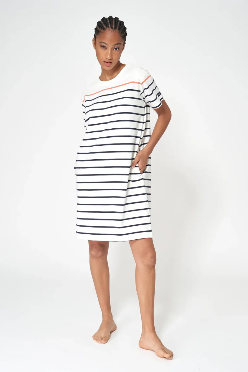 Vestido confeccionado en tejido 100% de algodón con estampado a rayas y manga corta.