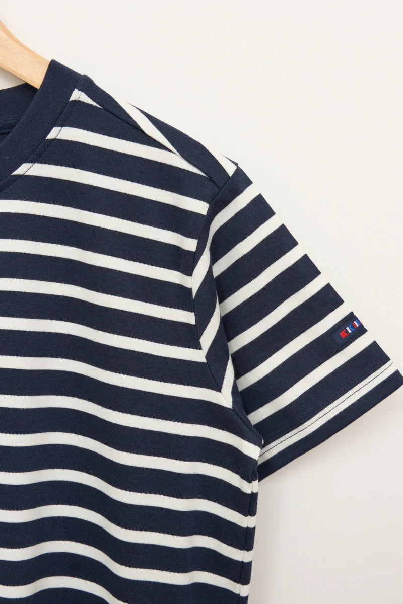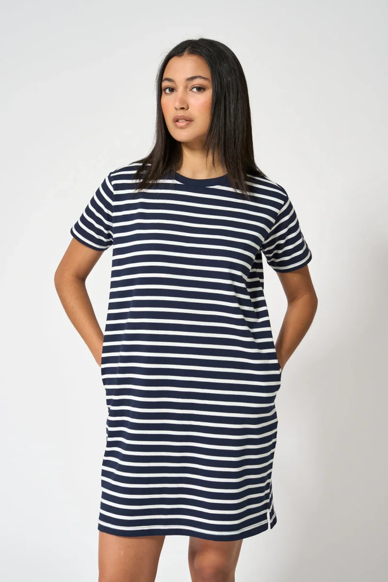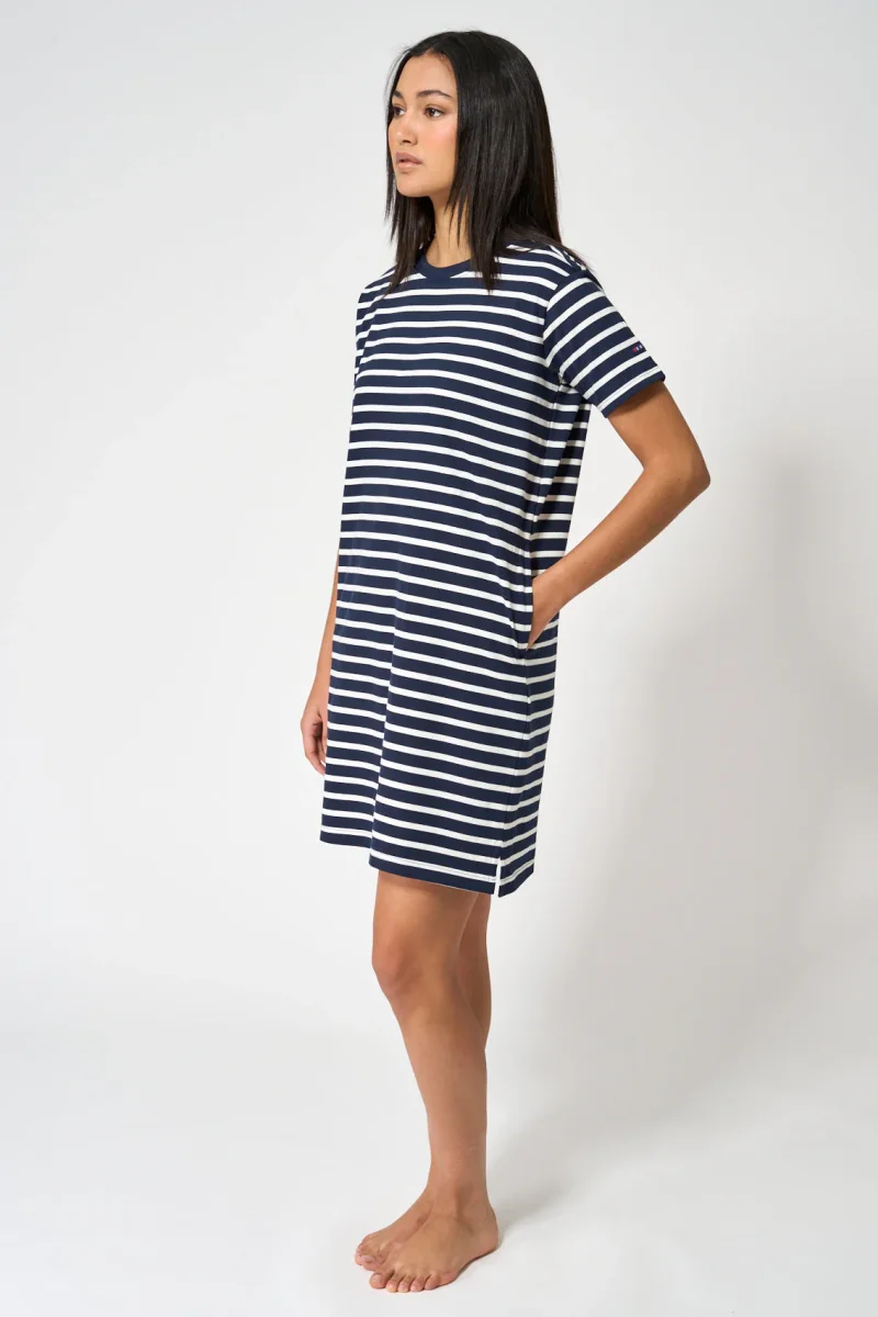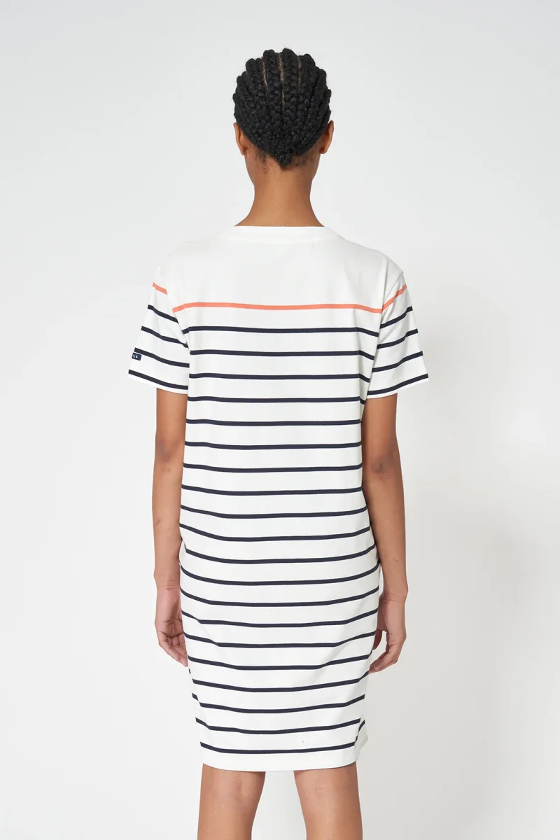 Vestido confeccionado en tejido 100% de algodón con estampado a rayas y manga corta.