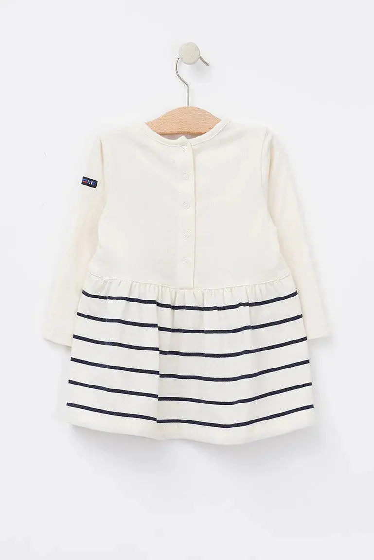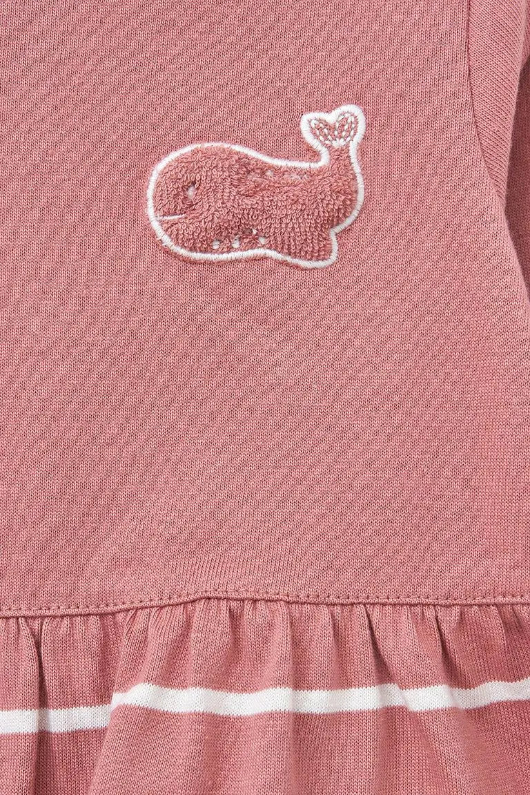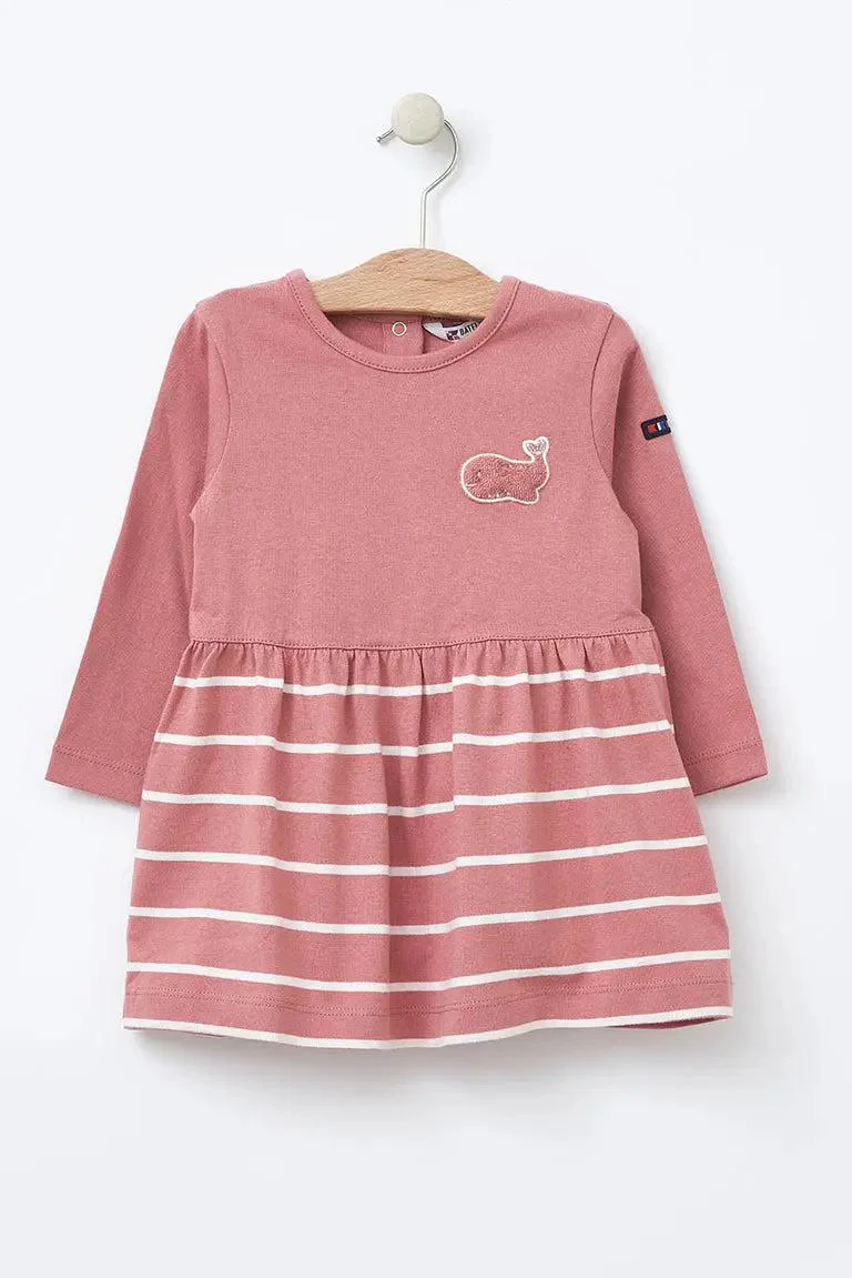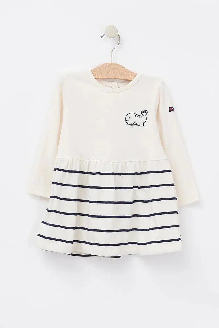 Vestido de algodón y manga larga con la parte superior lisa y la inferior a rayas. En la parte lisa lleva una pequeña ballena.