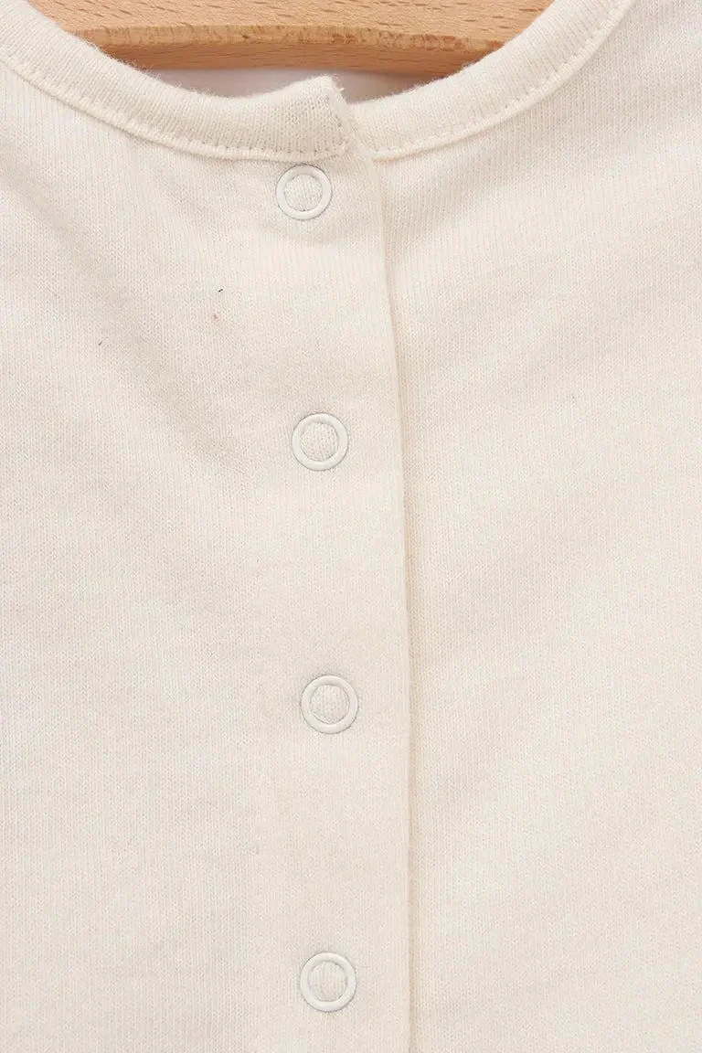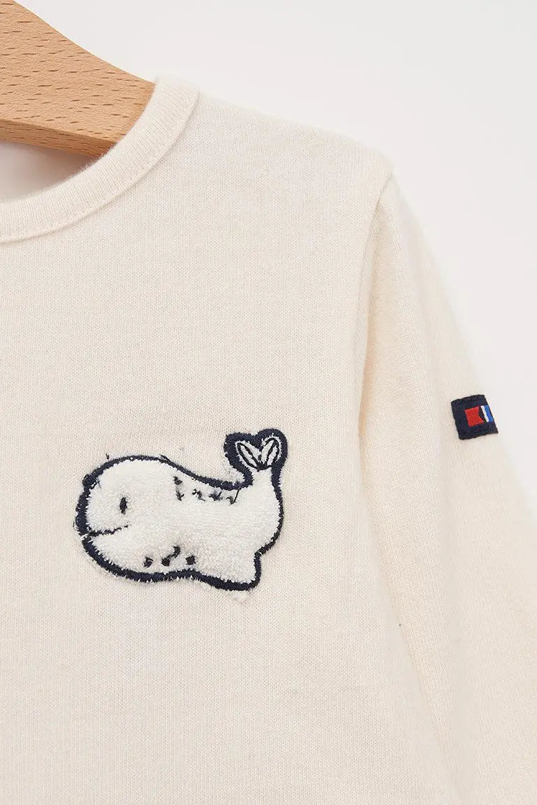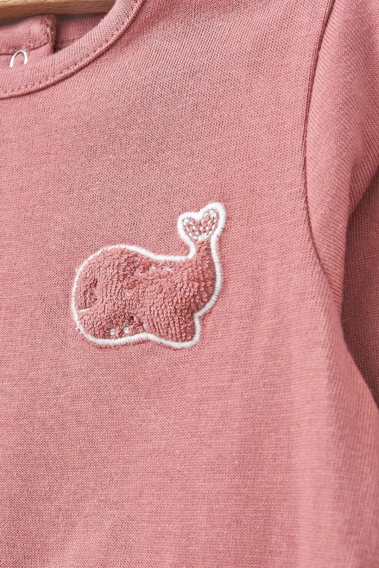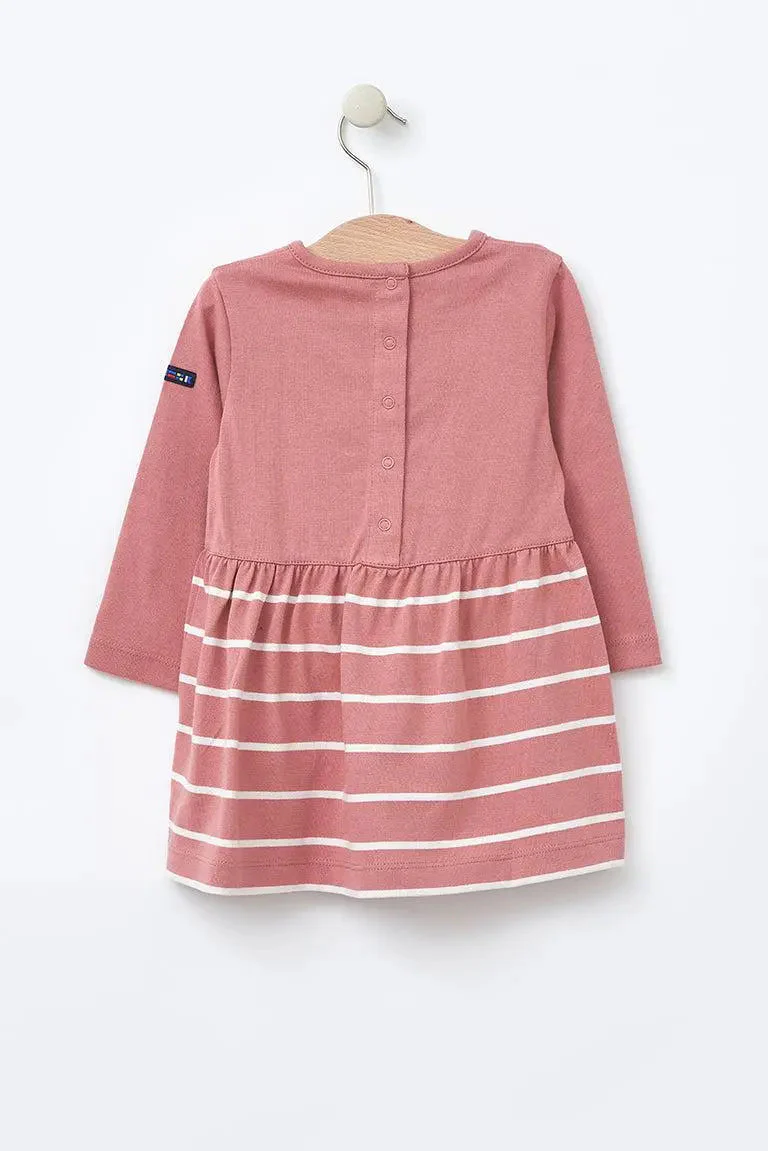 Vestido de algodón y manga larga con la parte superior lisa y la inferior a rayas. En la parte lisa lleva una pequeña ballena.