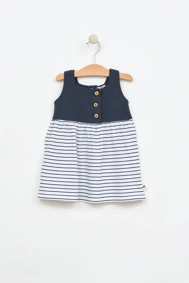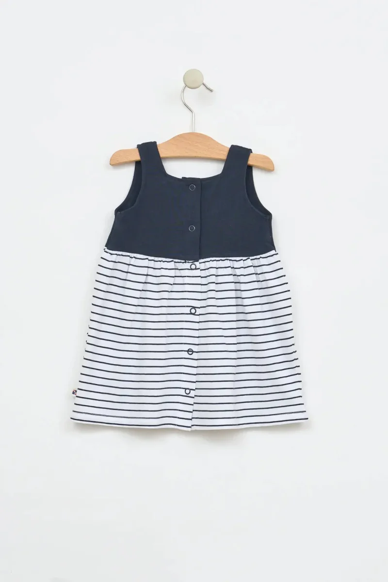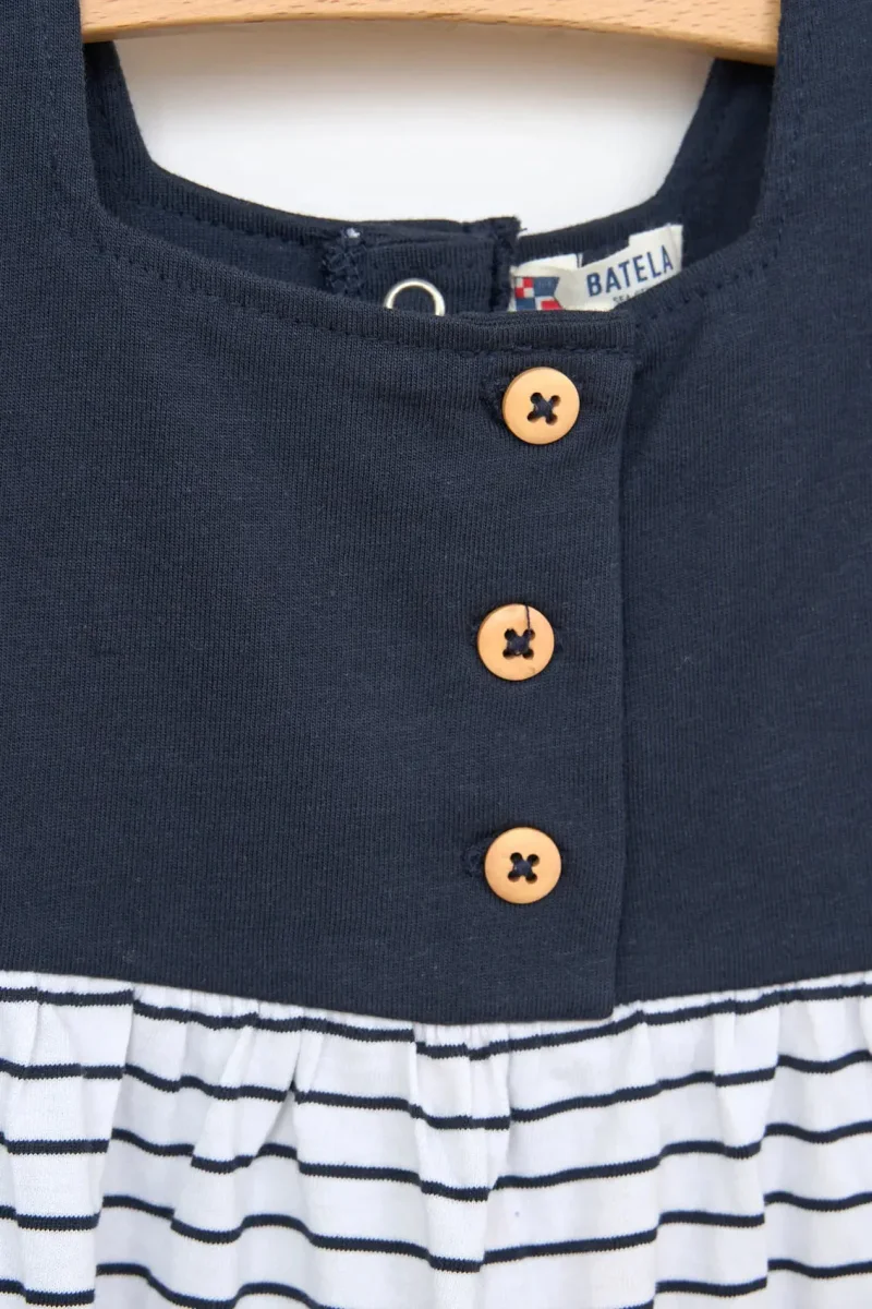 Vestido de tirantes confeccionado en 100% algodón de 180 gramos. Combina una parte lisa y otra a rayas y cuenta con una botonadura falsa en la parte frontal. Lleva una abertura abotonada en la espalda. REF.: B2608