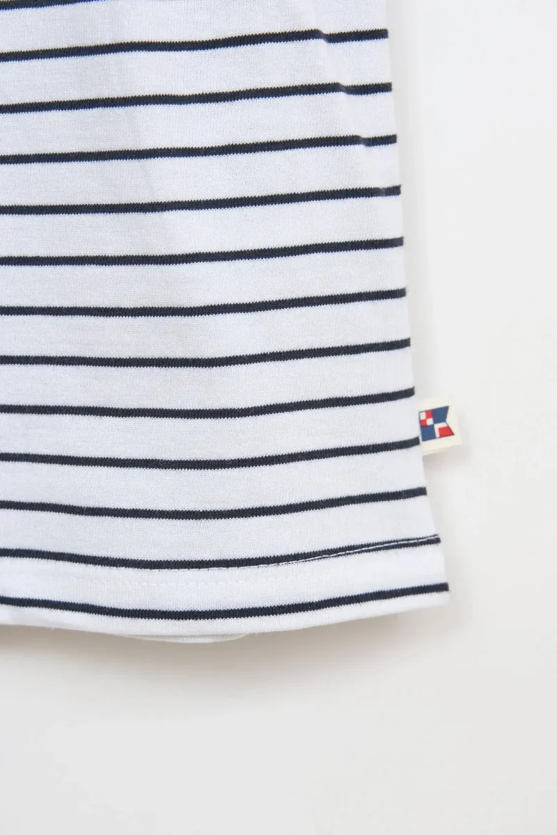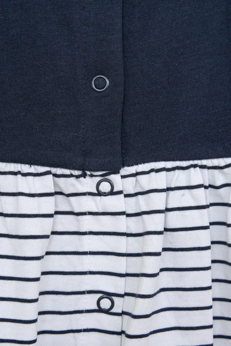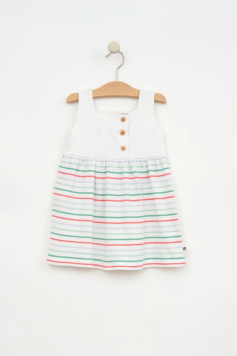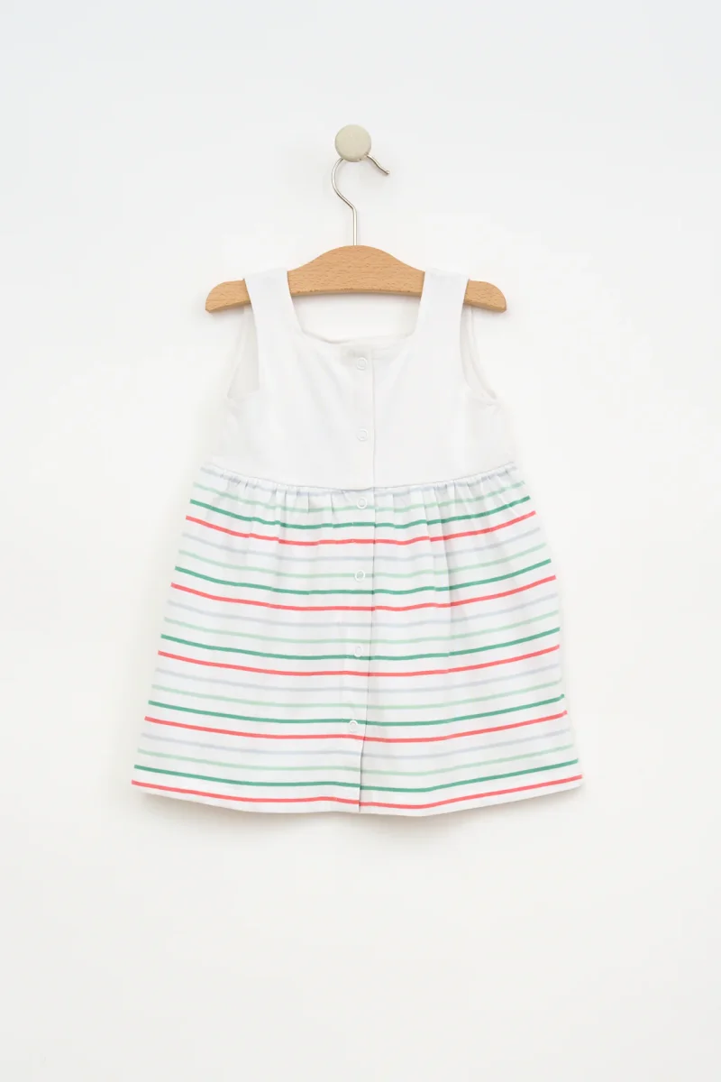 Vestido de tirantes confeccionado en 100% algodón de 180 gramos. Combina una parte lisa y otra a rayas y cuenta con una botonadura falsa en la parte frontal. Lleva una abertura abotonada en la espalda. REF.: B2608