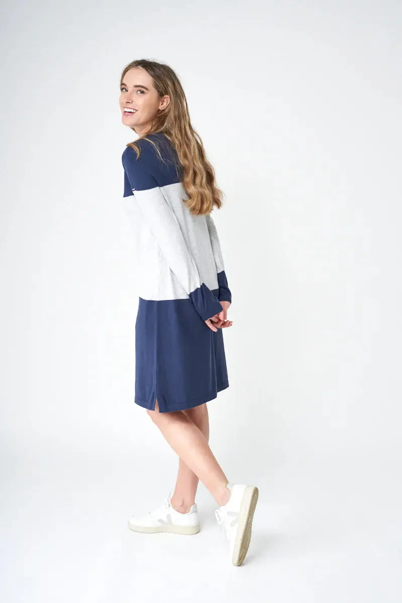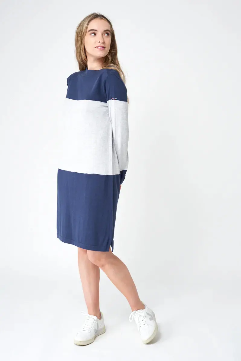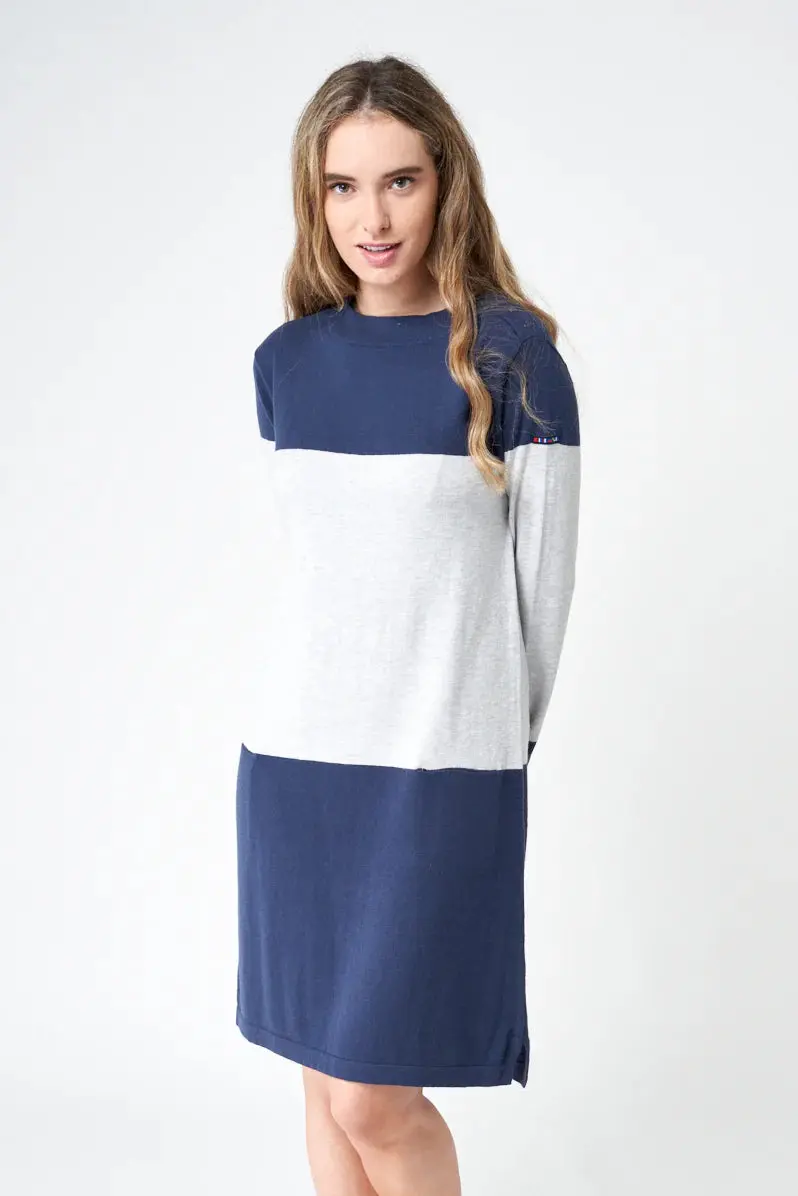 Vestido de manga larga y rayas anchas. Confeccionado en un tejido que combina algodón, nailon y angora.