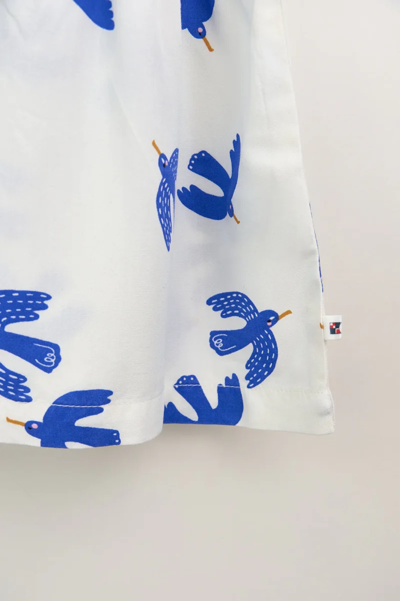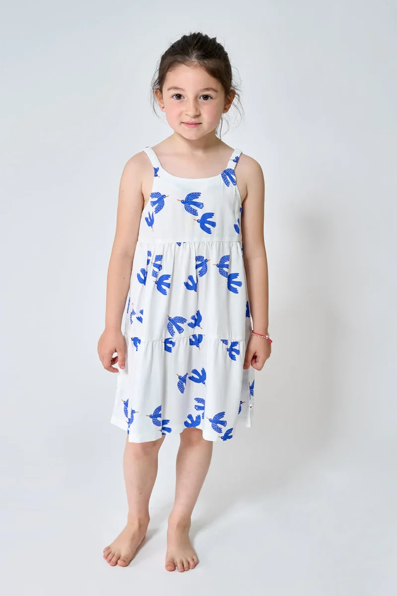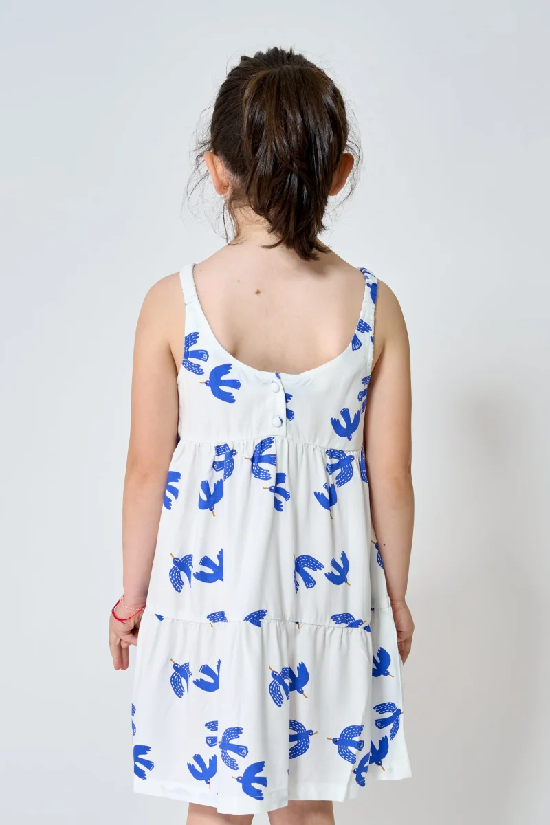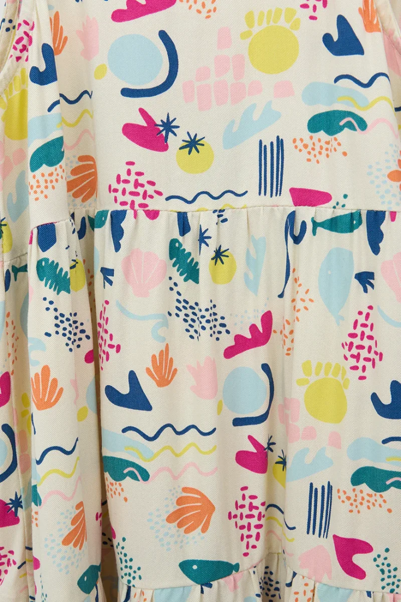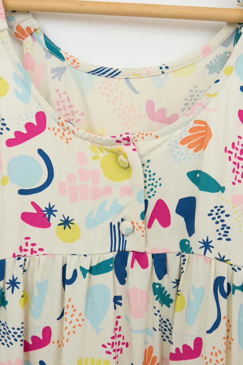 Vestido de tirantes para niña confeccionado en tejido 100% viscosa Ecovero. Tiene tirantes con goma, para un mayor ajuste, volantes y abertura de botones en la parte superior trasera. El detalle divertido se lo da el estampado de pájaros o de motivos marinos. REF.: N1906 La modelo lleva una talla 6.
