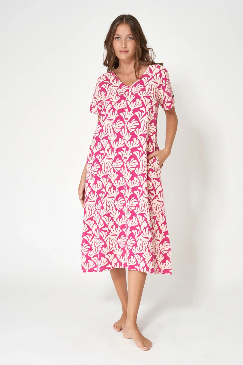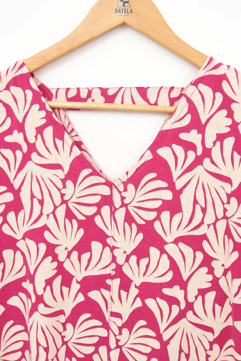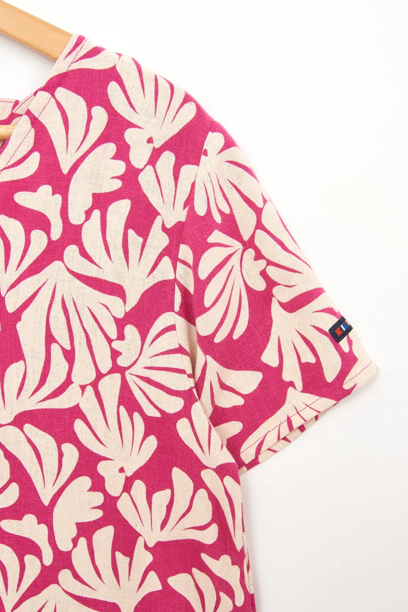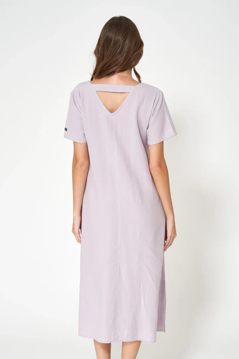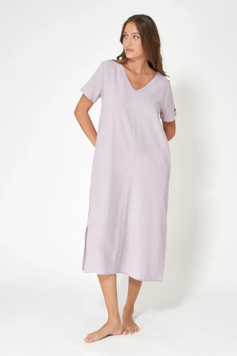 Vestido midi de línea recta en mezcla de lino. El cuello pico y la manga corta amplia aportan ligereza visual, mientras que las aberturas laterales acompañan el movimiento al caminar.